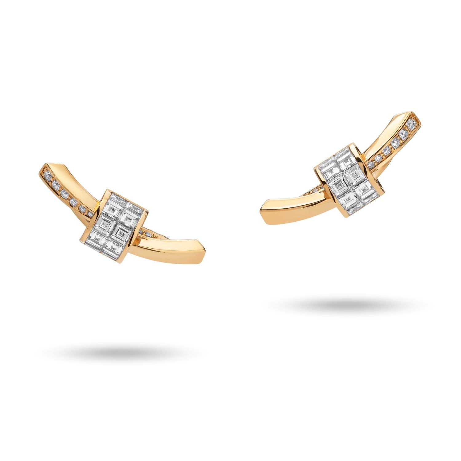 تتميز هذه الأقراط المصنوعة من الذهب الأصفر عيار 18 قيراطًا بعقدة مذهلة مزينة بصفين من الماس غير المرئي، مما يجسد براعة ستينزهورن المميزة. يخرج من العقدة طرفان منحنيان بشكل أنيق - أحدهما مزين بالماس المستدير والآخر مصقول لتباين أنيق.