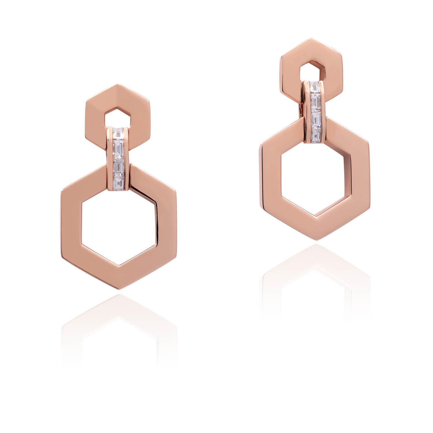تعكس أحجار الماس المستطيلة المطوّلة والمرصّعة بقناة قطرات متلألئة من الرحيق الحلو ، مما يخلق إحساسًا خطيًا هندسيًا عصريًا وأنيقًا.