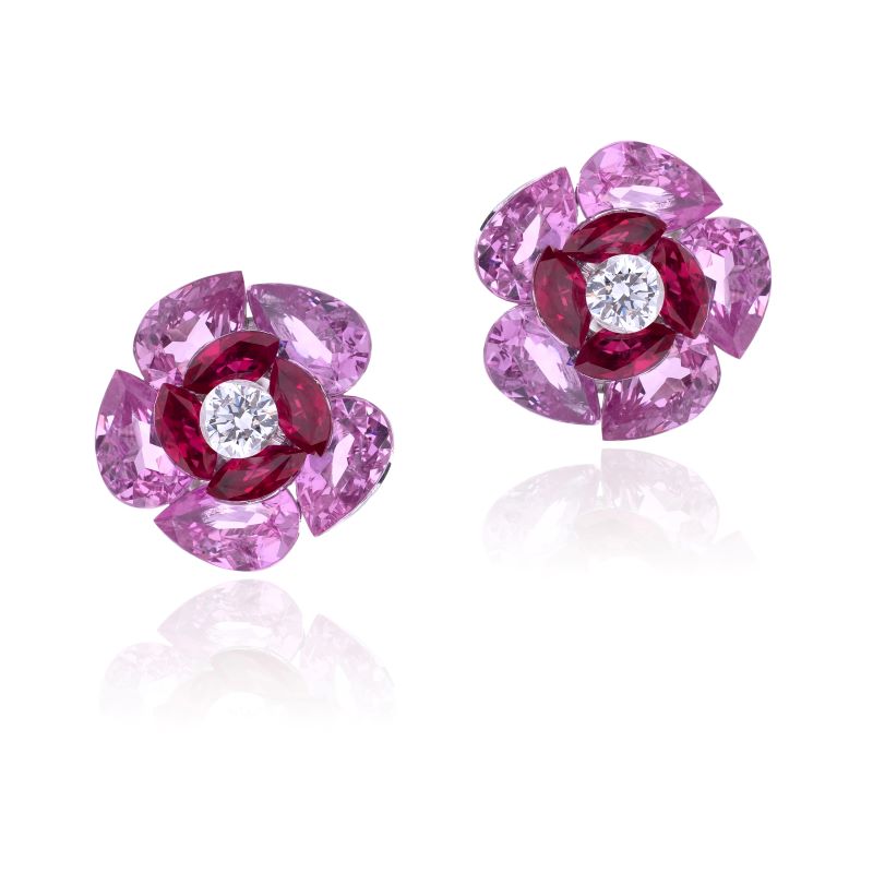 In dieser Kollektion werden rosa und rote Rosenblätter aus intensiven marquise-, oval- und birnenförmigen rosa Saphiren und Rubinen von einem funkelnden zentralen Diamanten unterbrochen, der die Stempel der Blume darstellt.