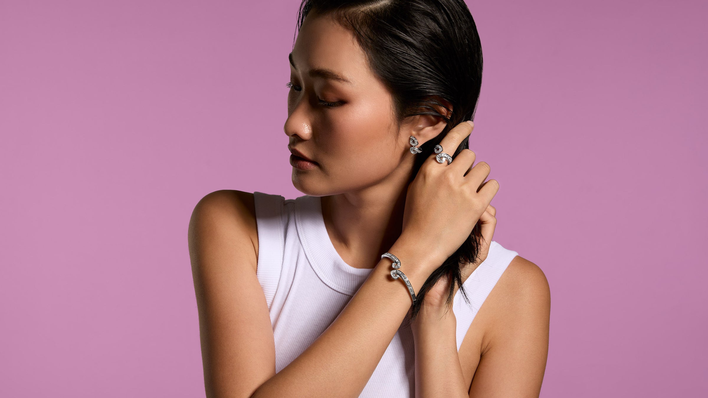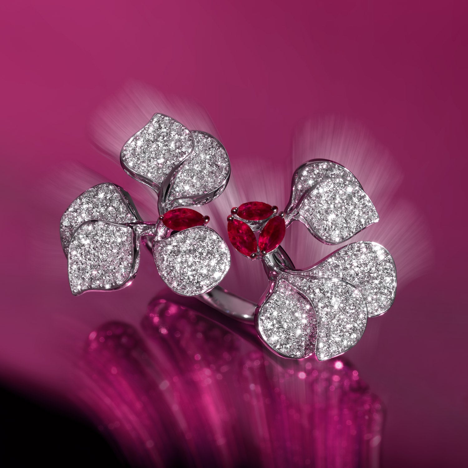 Stellen Sie sich vor, Sie spazieren durch einen heiteren Garten in Paris, in dem die Luft von dem süßen Duft blühender Blumen erfüllt ist, die sich anmutig in einer warmen Brise wiegen. Jedes Stück dieser bezaubernden Kollektion erzählt eine Geschichte von zarten Blütenknospen, die sich zur vollen Blüte entfalten und dabei eine exquisite Anmut und ätherische Leichtigkeit bewahren. Die Kollektion spiegelt dieses poetische Bild mit verspielten Designs wider, die mit schillernden Diamanten verziert sind, die wie Tautropfen auf zarten Blütenblättern schimmern.