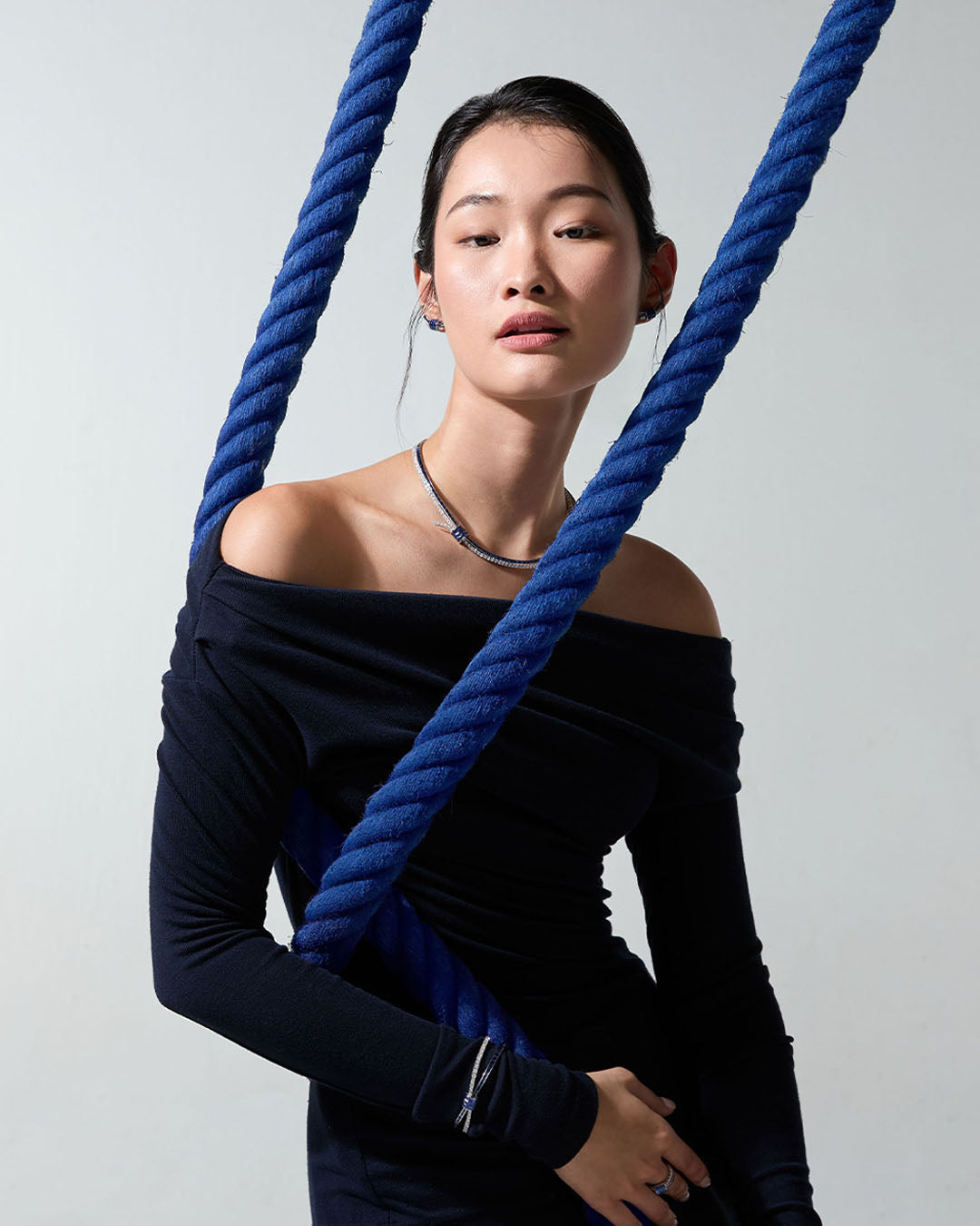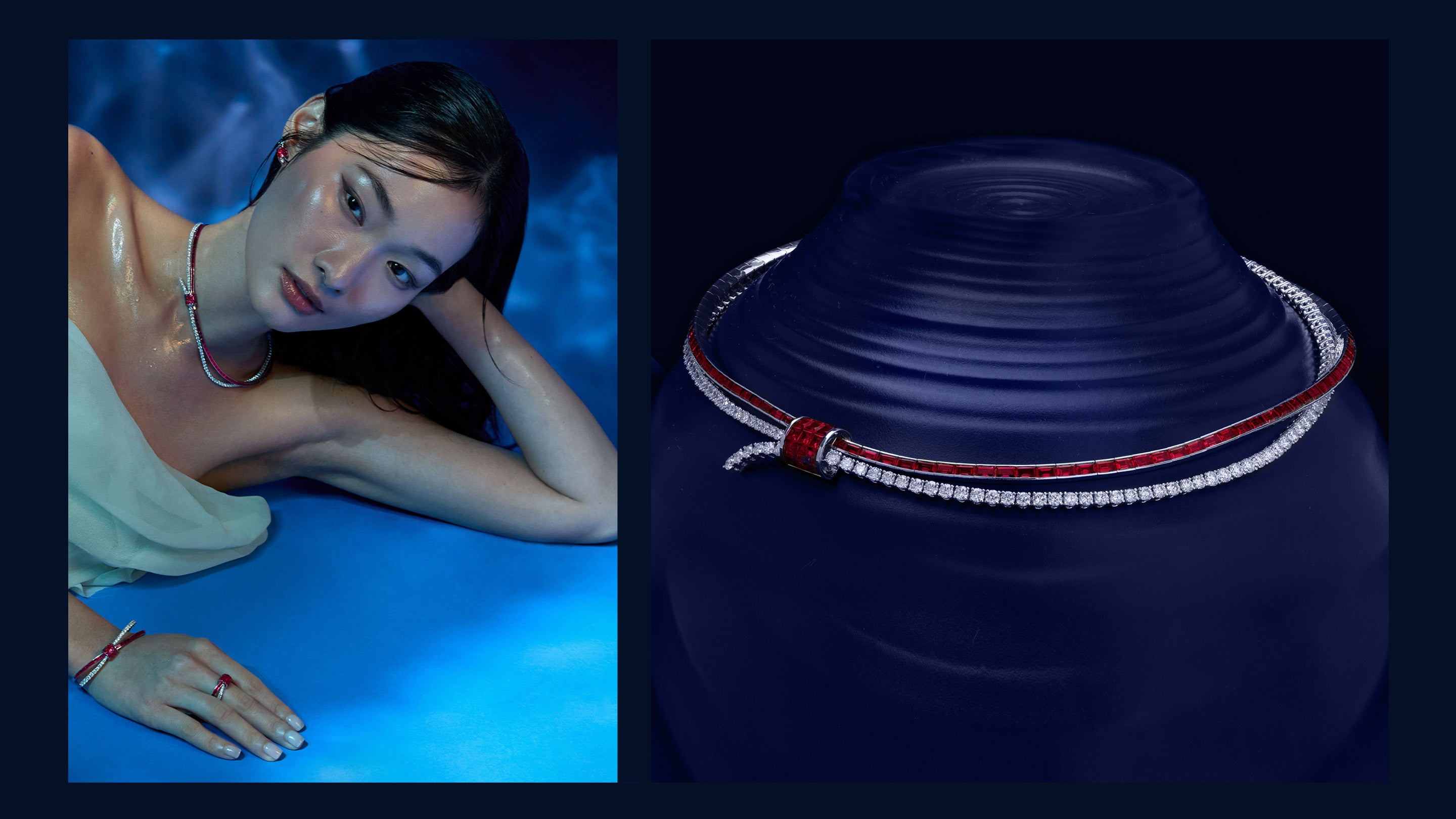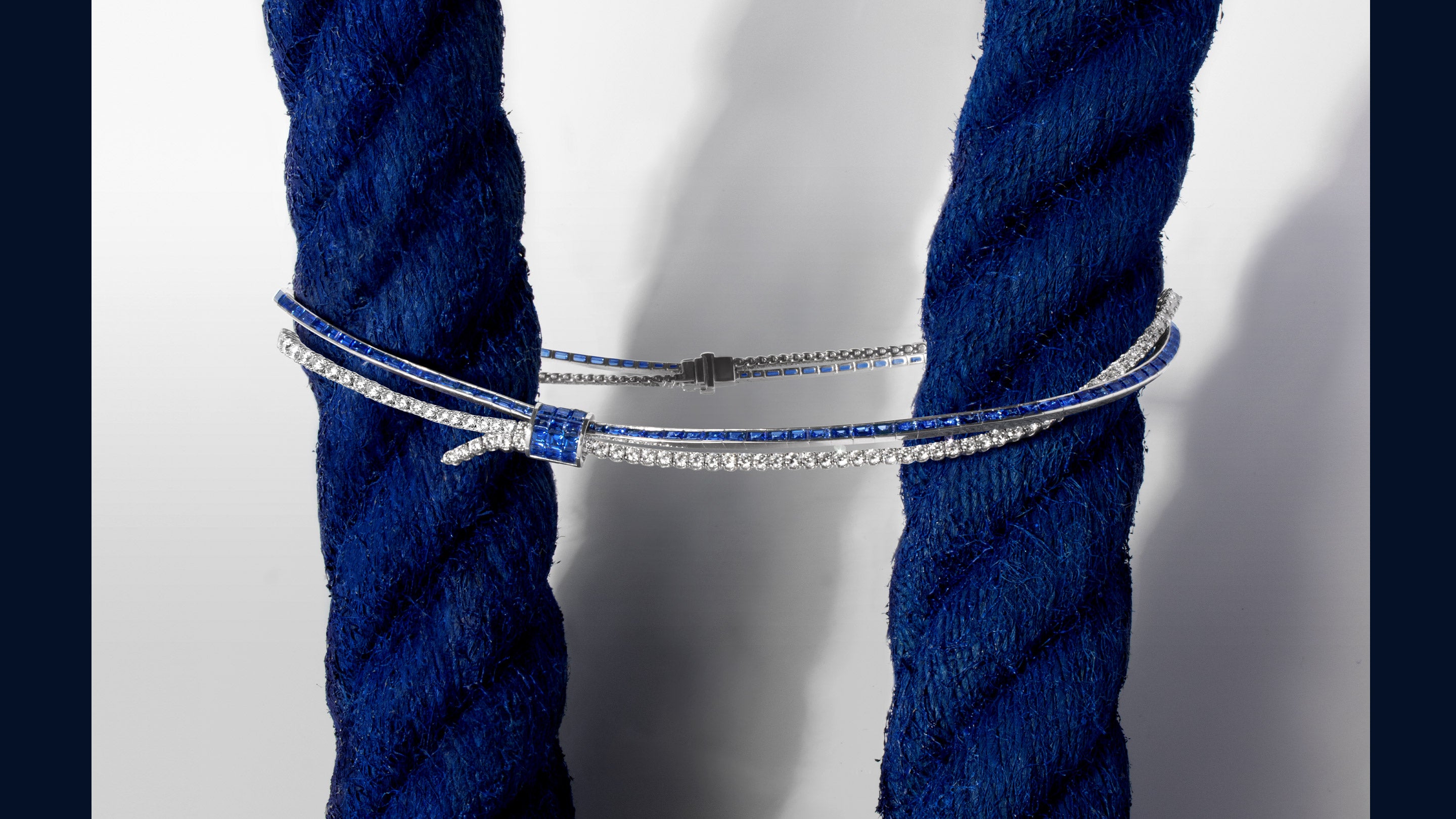 „Als Herzstück der Kollektion HOLD ON TIGHT verkörpert dieses Collier den emotionalen Kern der Geschichte. Im Zentrum steht der Knoten – besetzt mit drei Reihen unsichtbar gefasster Diamanten oder Rubine – als Symbol für Verbundenheit und innere Stärke. Von dort entfalten sich feine Stränge wie gelöste Seile – Sinnbilder für Momente des Loslassens, der Kraft und des Vertrauens in den eigenen Weg. Dieses Schmuckstück erzählt von dem leisen Mut, festzuhalten und zugleich loszulassen.