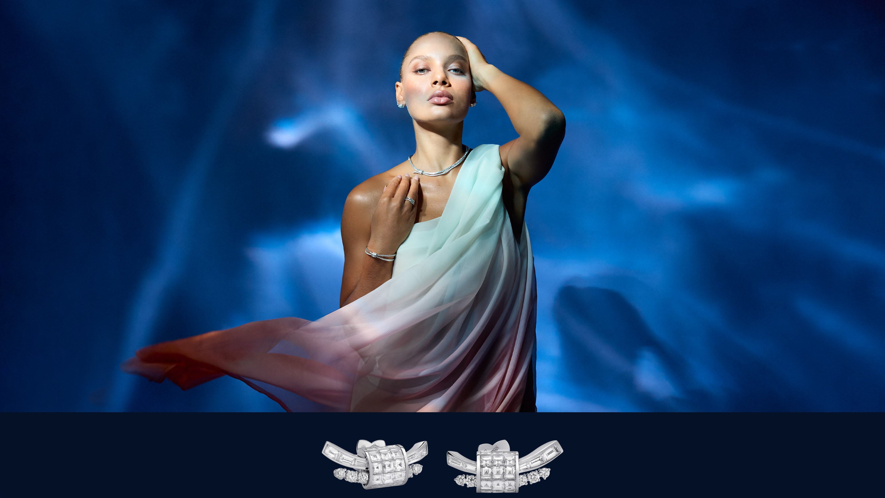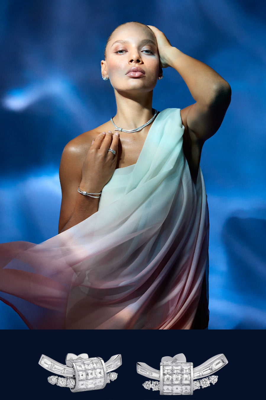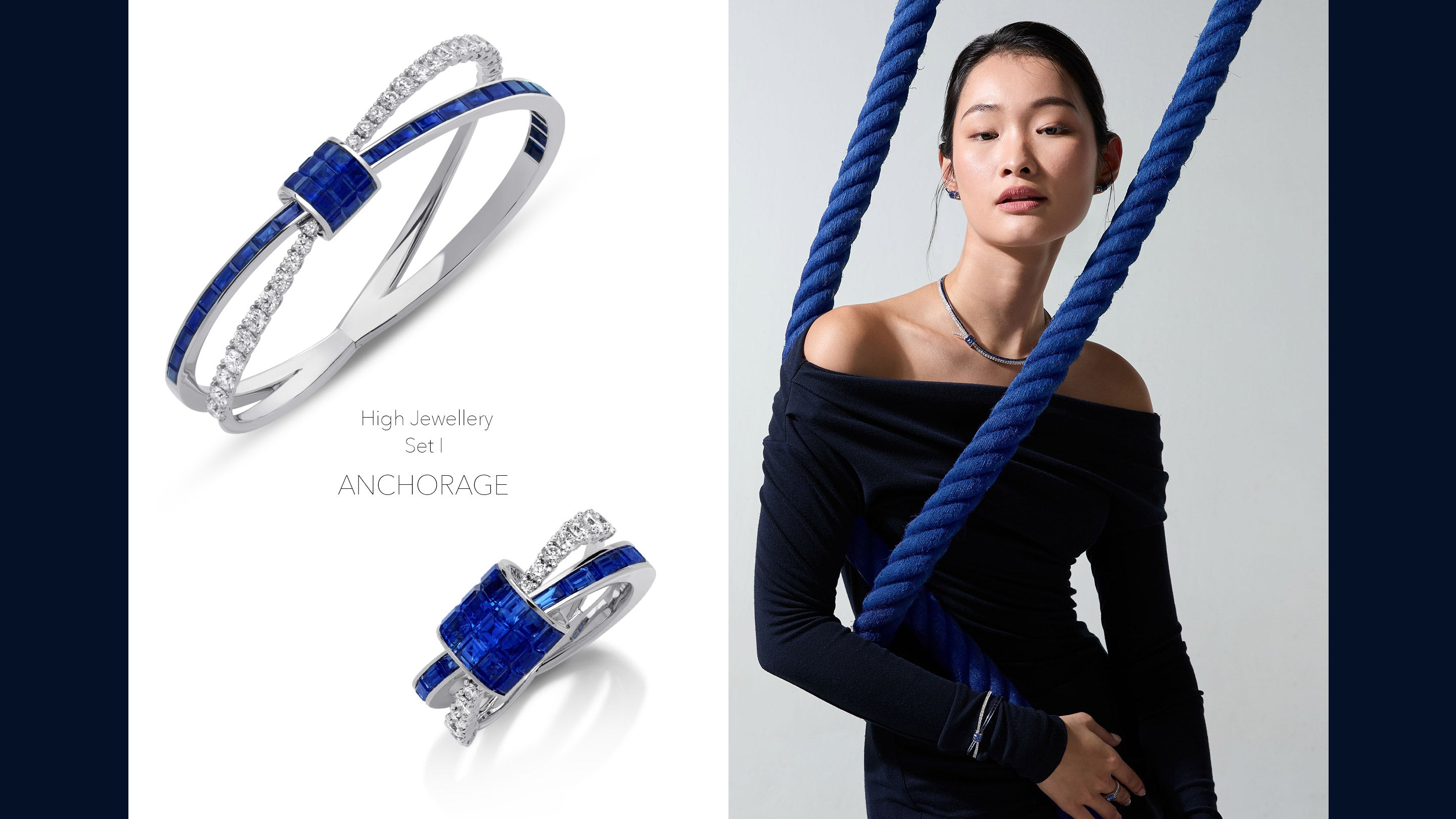 „Als Herzstück der Kollektion HOLD ON TIGHT verkörpert dieses Collier den emotionalen Kern der Geschichte. Im Zentrum steht der Knoten – besetzt mit drei Reihen unsichtbar gefasster Diamanten oder Rubine – als Symbol für Verbundenheit und innere Stärke. Von dort entfalten sich feine Stränge wie gelöste Seile – Sinnbilder für Momente des Loslassens, der Kraft und des Vertrauens in den eigenen Weg. Dieses Schmuckstück erzählt von dem leisen Mut, festzuhalten und zugleich loszulassen.