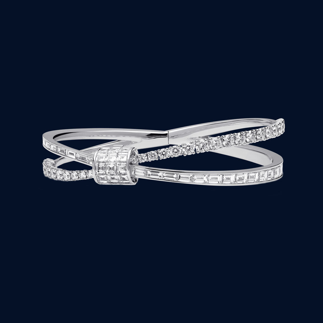 Im Gegensatz zu traditionellen Designs ist der Knoten bewusst außermittig gesetzt – ein modernes Stilmittel, das dem Schmuckstück eine unerwartete Balance verleiht. Die verschlungene Struktur erinnert an das Zusammenspiel ineinander gedrehter Seile, die sich fließend überkreuzen. Unterschiedliche Fassarten betonen dabei den Kontrast zwischen den beiden Strängen und unterstreichen ihr lebendiges Wechselspiel.