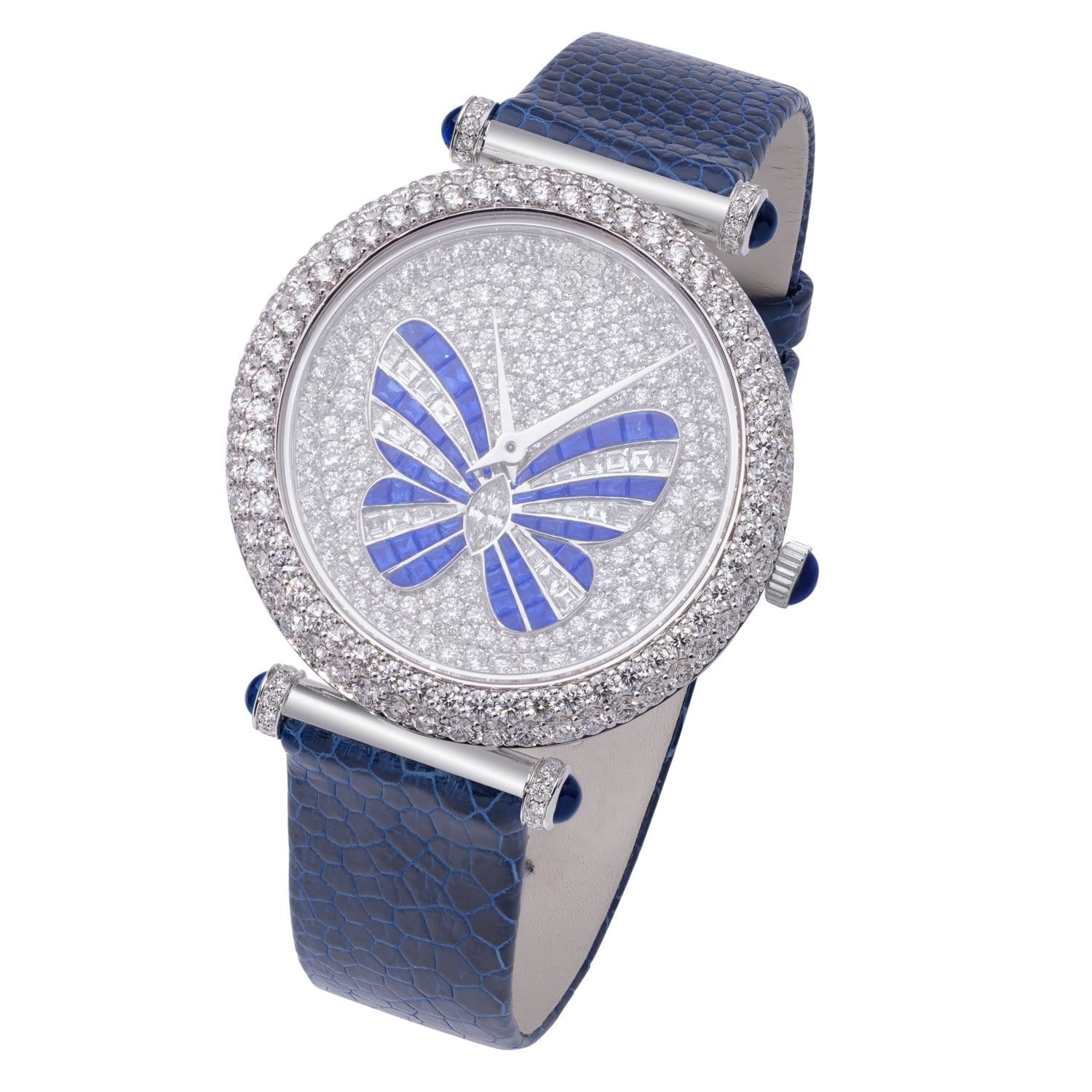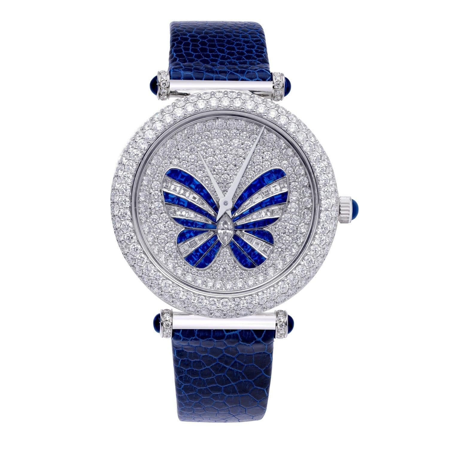 Sorgfältig ausgewählte und präzise geschliffene Edelsteine und Diamanten sind zwischen feinen Goldbarren gefasst. Die zarten Zeiger bilden den Fühler des Schmetterlings, ein reizvolles Merkmal, das man nur aus der Nähe bewundern kann.
