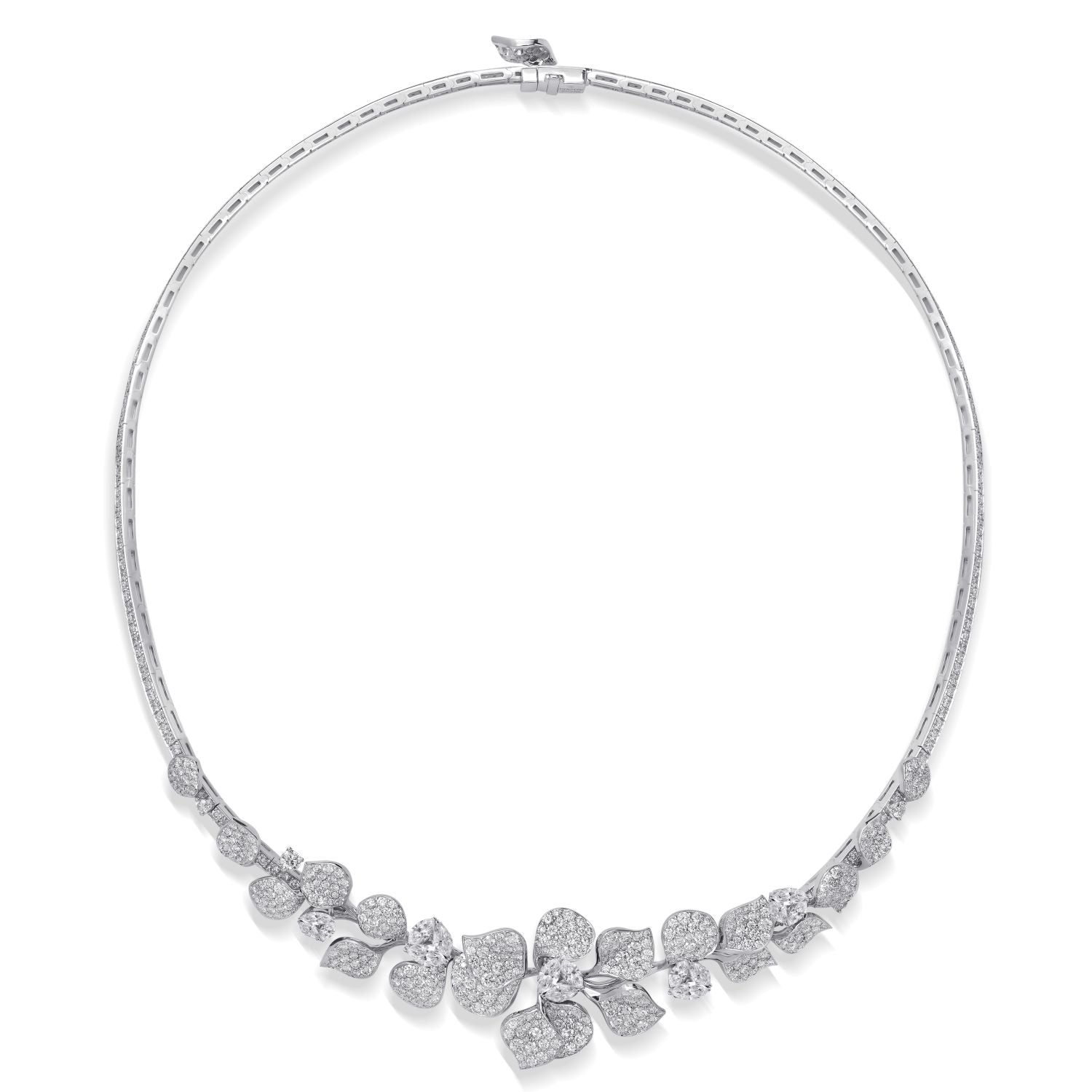 ア・フルール・ド・パリ ダイヤモンド コリエは 、パリの春を謳歌する輝きを放ち、咲き誇る花びらを繊細にアレンジしています。18Kゴールドのネックレスには、パヴェセッティングされたダイヤモンドの花が複雑に連なり、その花びらが輝きを放ちます。エレガントなクローズフィットシルエットで、時代を超越した洗練を感じさせるネックレス。