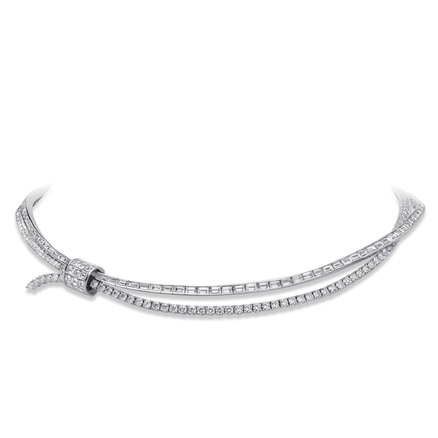 絡み合うフォルムのエレガンスを表現した18Kホワイトゴールドのネックレス。流れるようなロープを思わせる繊細な2本のストランドが、3列のインビジブルセッティングダイヤモンドで飾られたオフセンターの結び目で交わるデザイン。このシームレスな輝きが、力強さと洗練を体現する印象的なフォーカルポイントを生み出します。