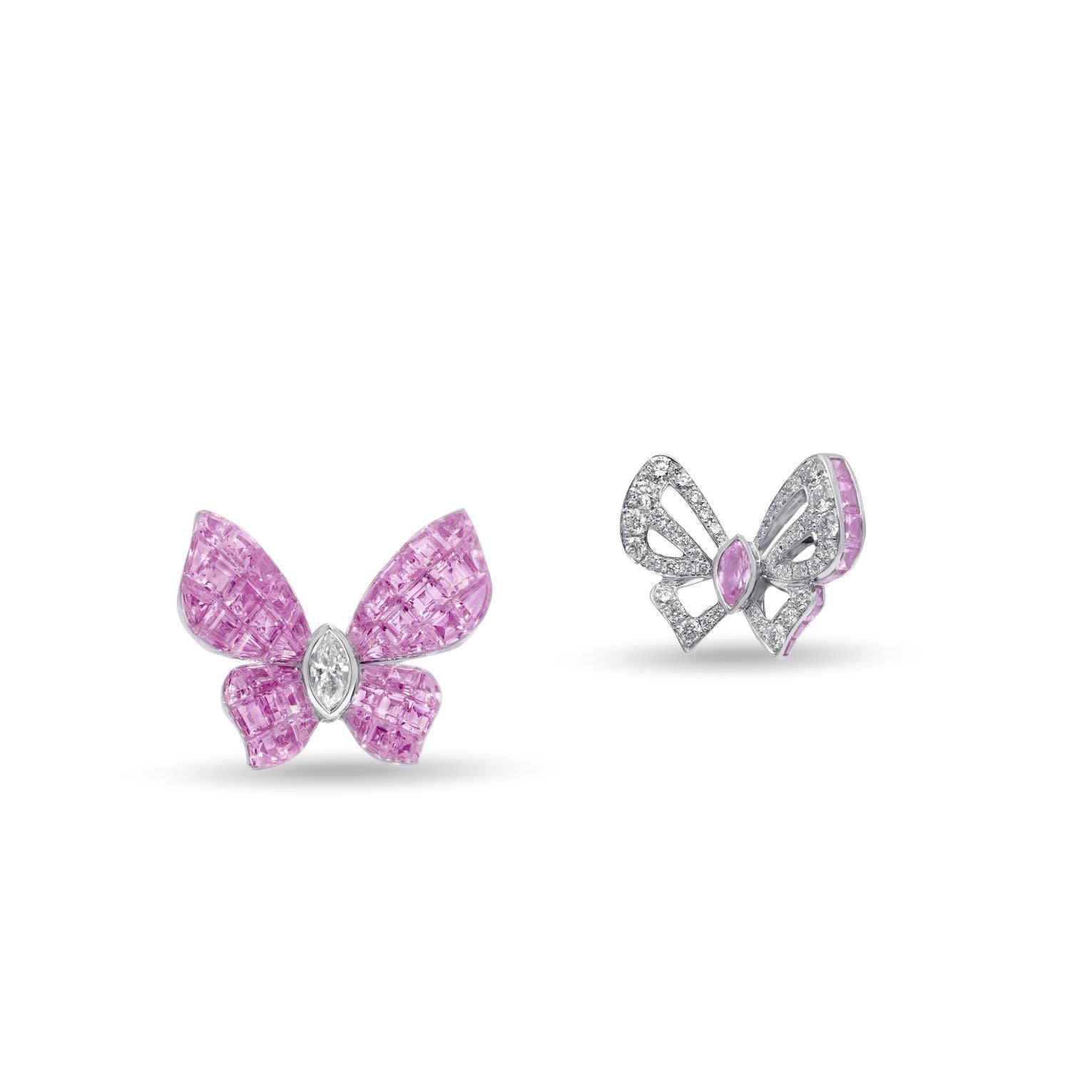 Fine rails of invisible-set pink sapphires trace the delicate veins of the butterfly’s wings, while a single marquise-cut diamond or vibrant coloured gemstone forms its graceful body.
