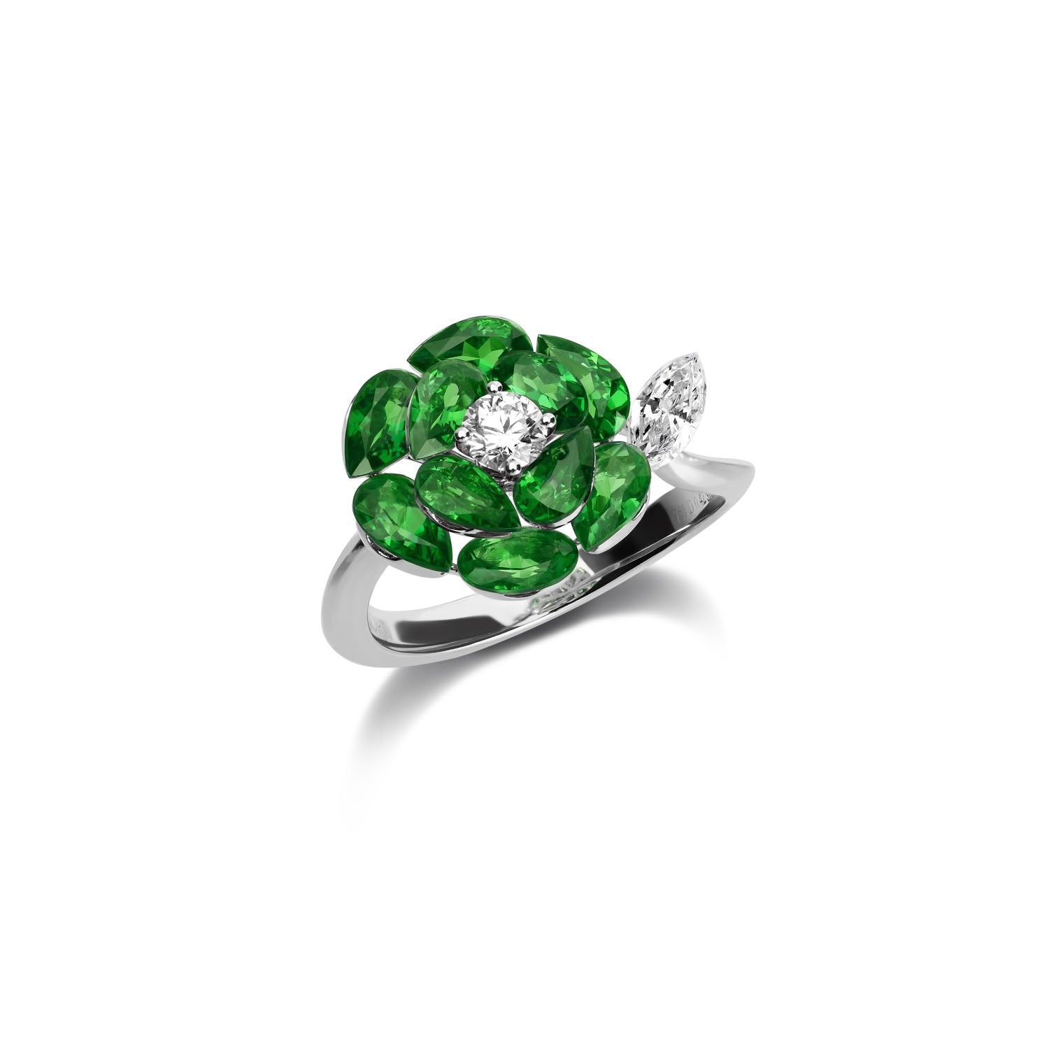 In this collection, rose petals made of intense marquise, oval, and pear-shaped tsavorites are punctuated by a sparkling central diamond, rendering the pistils of the flower.